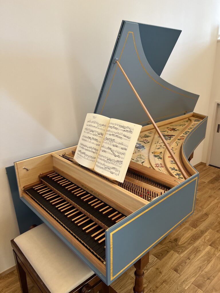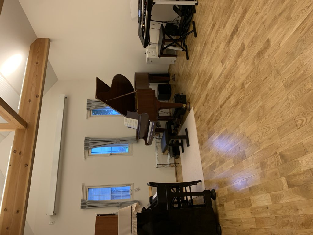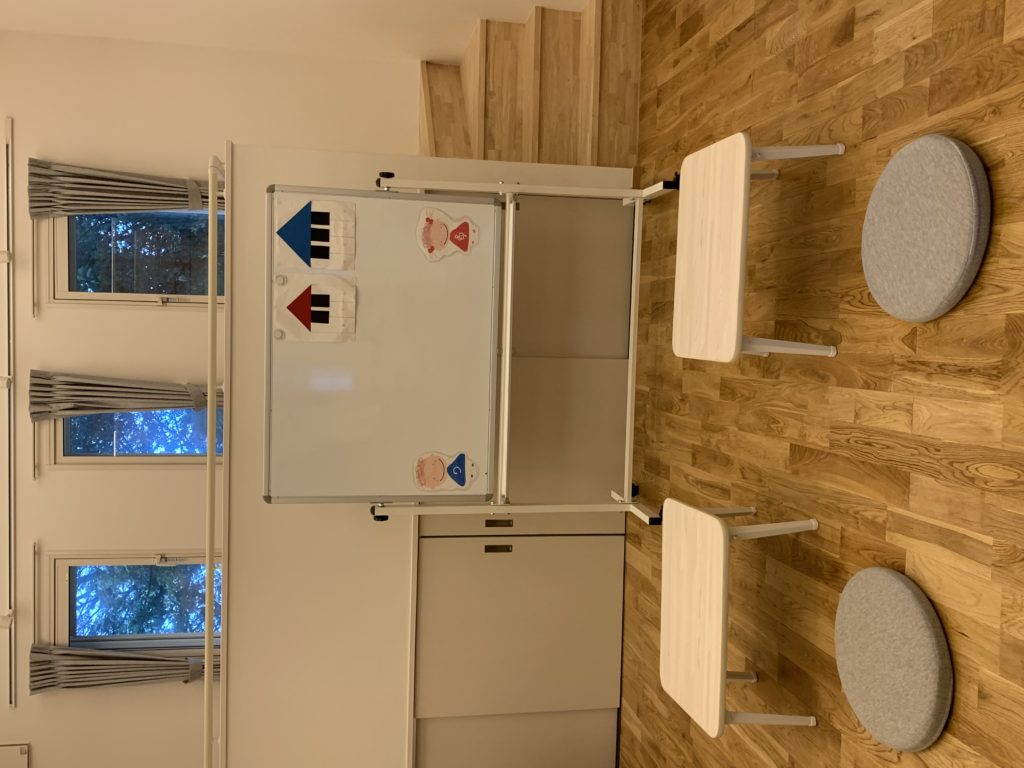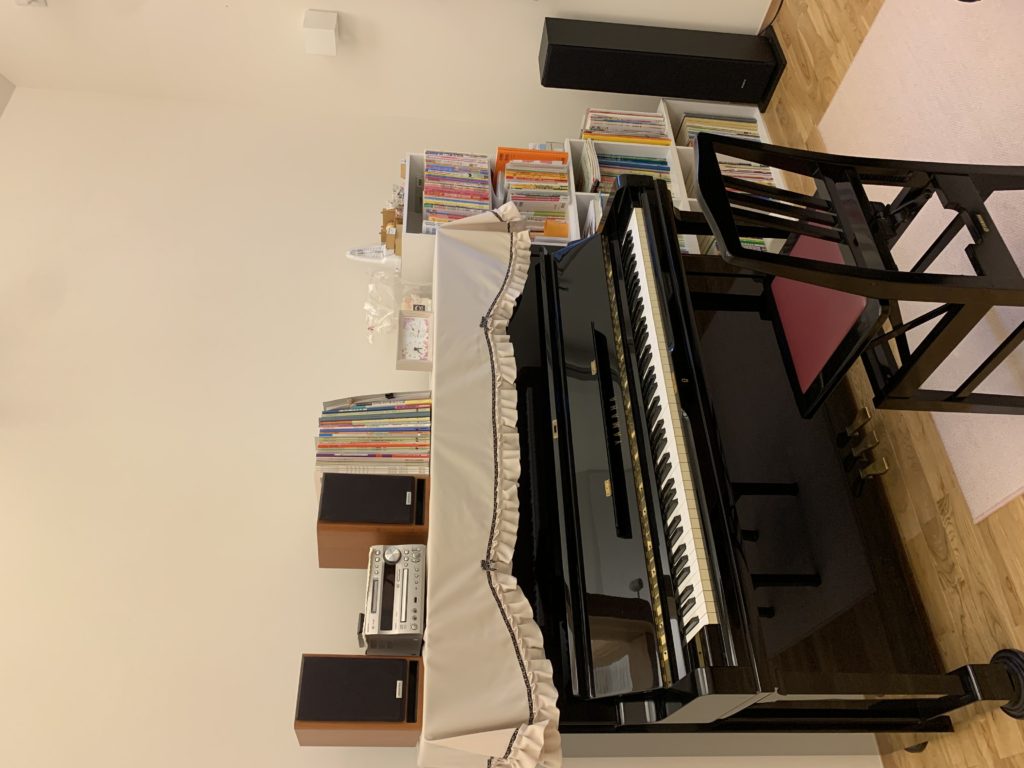 レッスン室は白を基調としています。間接照明なのでぬくもりのある明るさです。5~6人までのグループレッスンやリトミックができるくらいの広さがあり、音響にも優れているのでのびのびとピアノを弾くことができます。